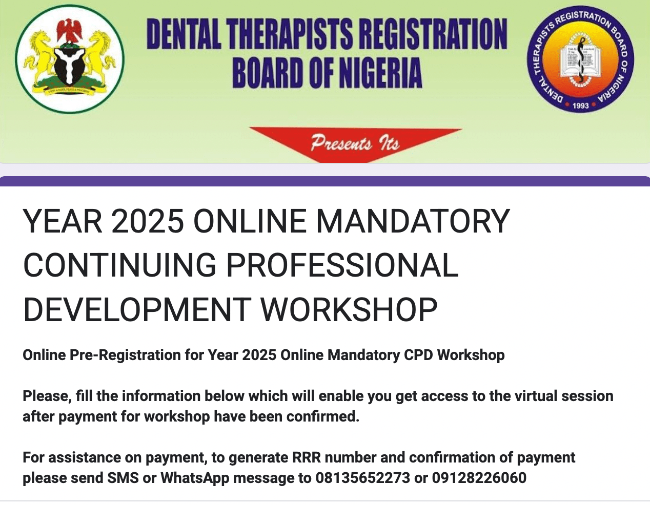 Dear Professionals, The Dental Therapists’ Registration Board of Nigeria is organizing its year 2025 Online Mandatory Continuing Professional Development Workshop (MCPD – 5credit Units) for all Dental Therapists, Dental Surgery […]